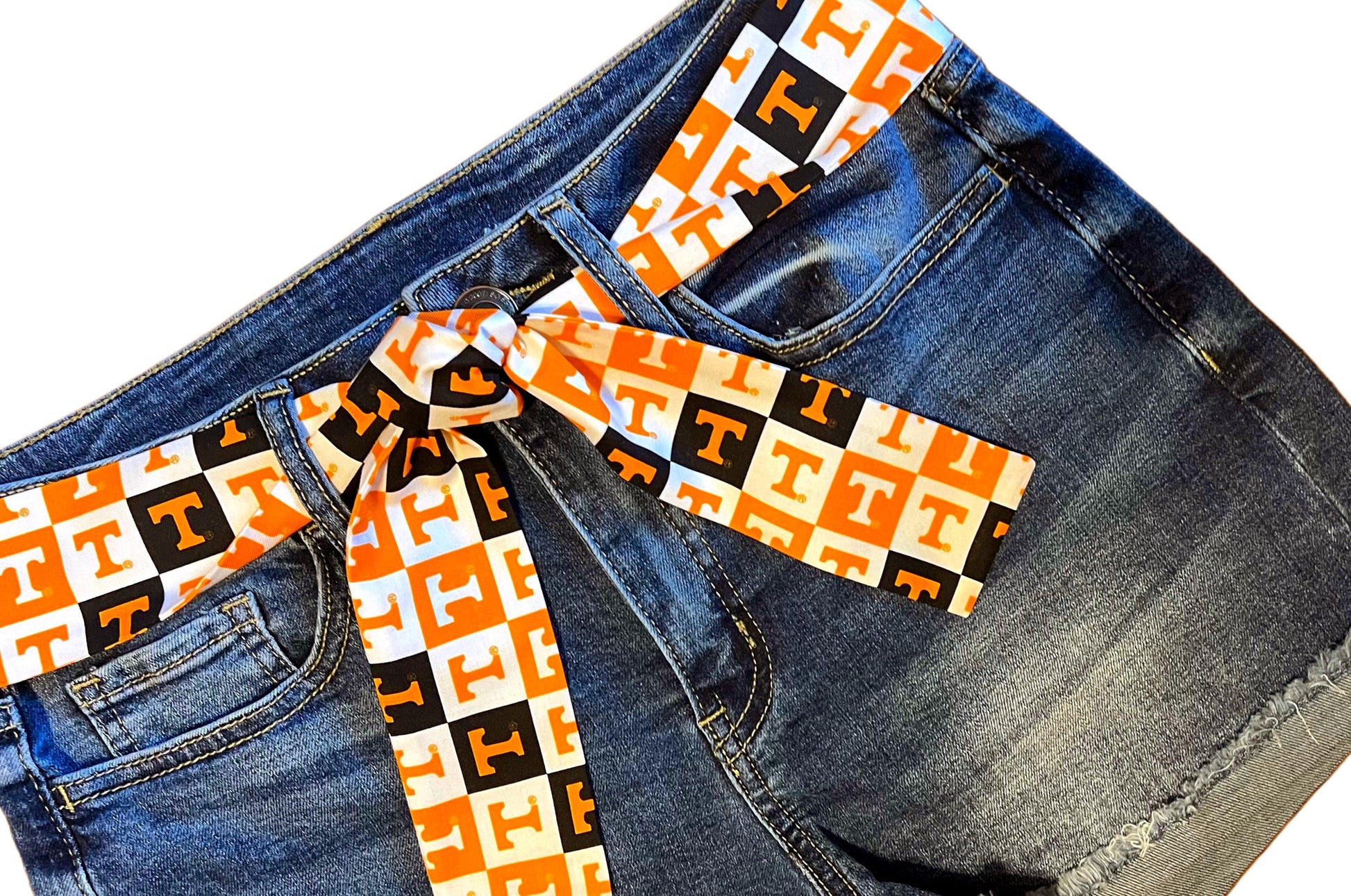 Get Game Day ready in this University of Tennessee block print sash belt. Depending on your waist size and the length you choose, you can tie this sash in a simple knot (as shown) or in a bow with longer-hanging tails. Tie in front, in back, or on the side.